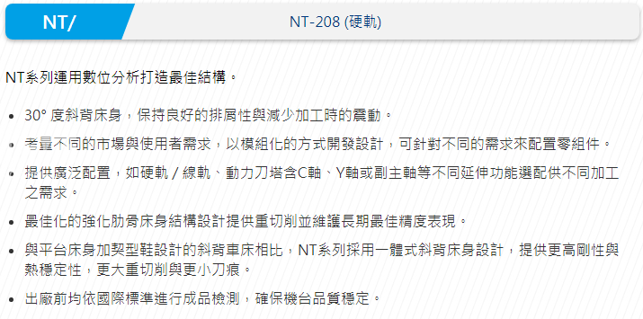 產(chǎn)品型號(hào):NT-208 (硬軌)斜床身數(shù)控車(chē)床|NT-208 (硬軌)斜床身數(shù)控車(chē)床|NT-208 (硬軌)斜床身數(shù)控車(chē)床|NT-208 (硬軌)斜床身數(shù)控車(chē)床|NT-208 (硬軌)斜床身數(shù)控車(chē)床|