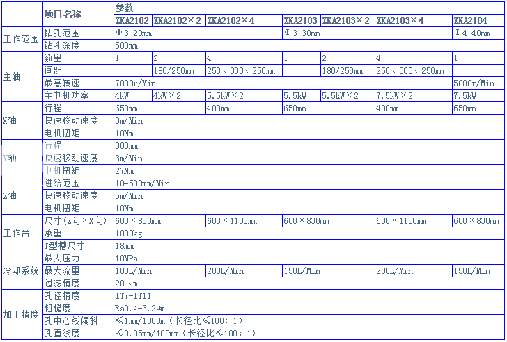 ZKA21系三坐標(biāo)數(shù)控深孔鉆機(jī)床采用槍鉆加工方式(外排屑),刀具旋轉(zhuǎn)進(jìn)給,工件固定在工作臺(tái)上,工作臺(tái)可以垂直和橫向移動(dòng);采用進(jìn)口或國(guó)產(chǎn)的數(shù)控系統(tǒng),具有單動(dòng)和自動(dòng)循環(huán)功能,三個(gè)伺服軸:X軸、Y軸、Z軸,采用伺服電機(jī)驅(qū)動(dòng)滾珠絲杠副實(shí)現(xiàn)各軸的移動(dòng);刀具轉(zhuǎn)速和進(jìn)給量均為無級(jí)調(diào)速。******鉆孔直徑是20mm、30mm、40mm三種規(guī)格。具有鉆削直孔、斜孔、盲孔和階梯孔的功能。廣泛應(yīng)用于汽車、摩托車行業(yè)、模具行業(yè)、軍工行業(yè)、航天工業(yè)、液壓閥體、齒輪軸類等零件的小深孔加工。